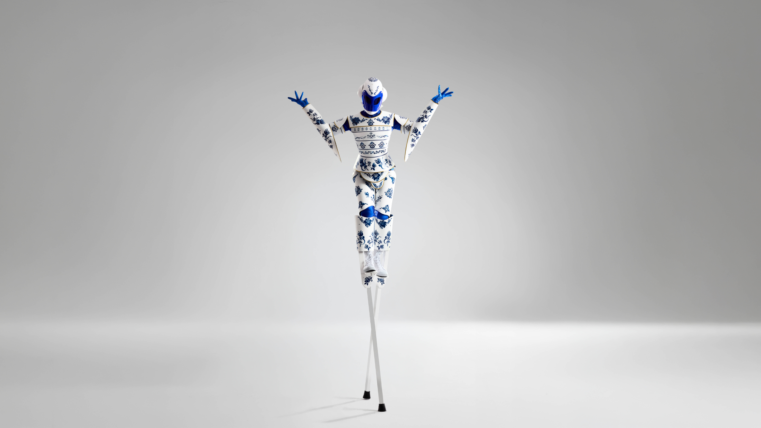 Unsere neuen PORZELLAN-Kostüme wirken wie lebendig gewordene Kunstobjekte: zwei plastisch-künstliche Figuren auf hohen Plateauschuhen und eine majestätische 3 Meter hohe Stelzenfigur.